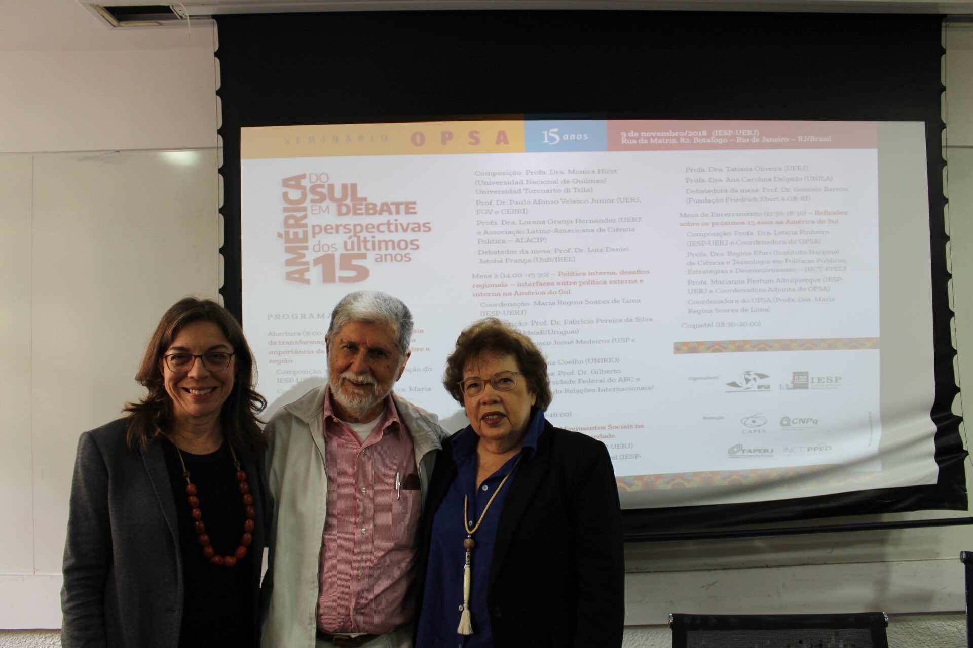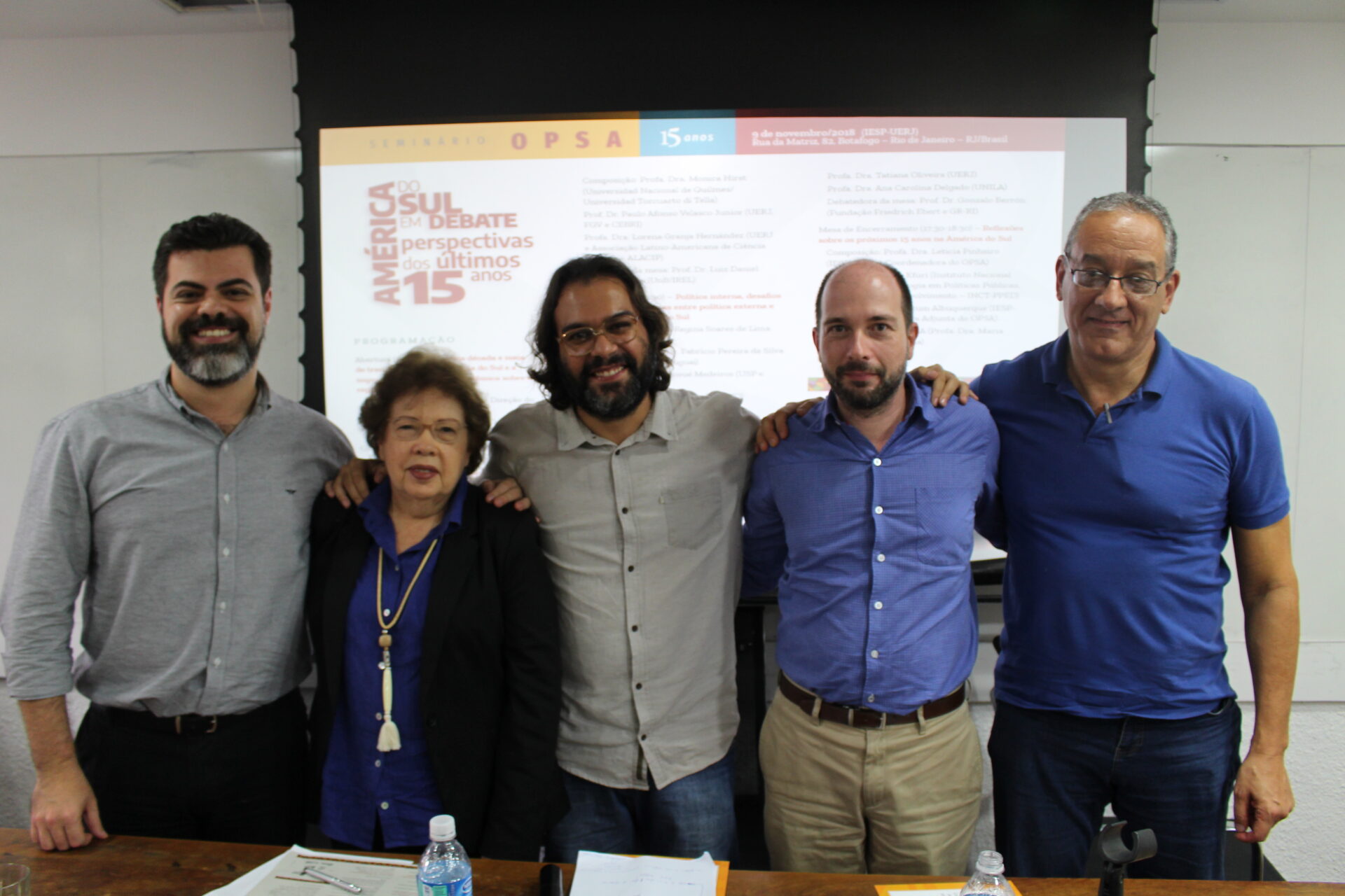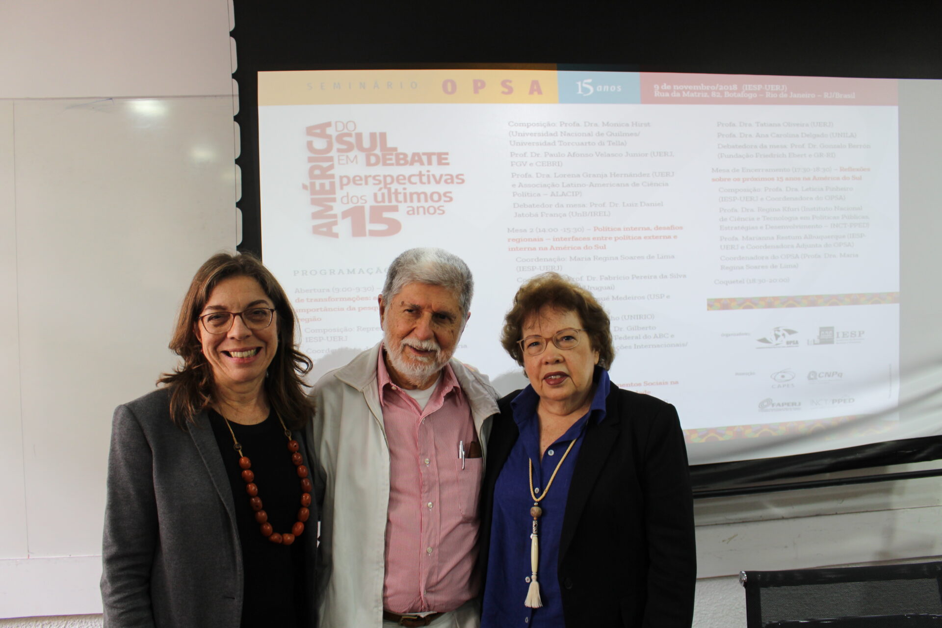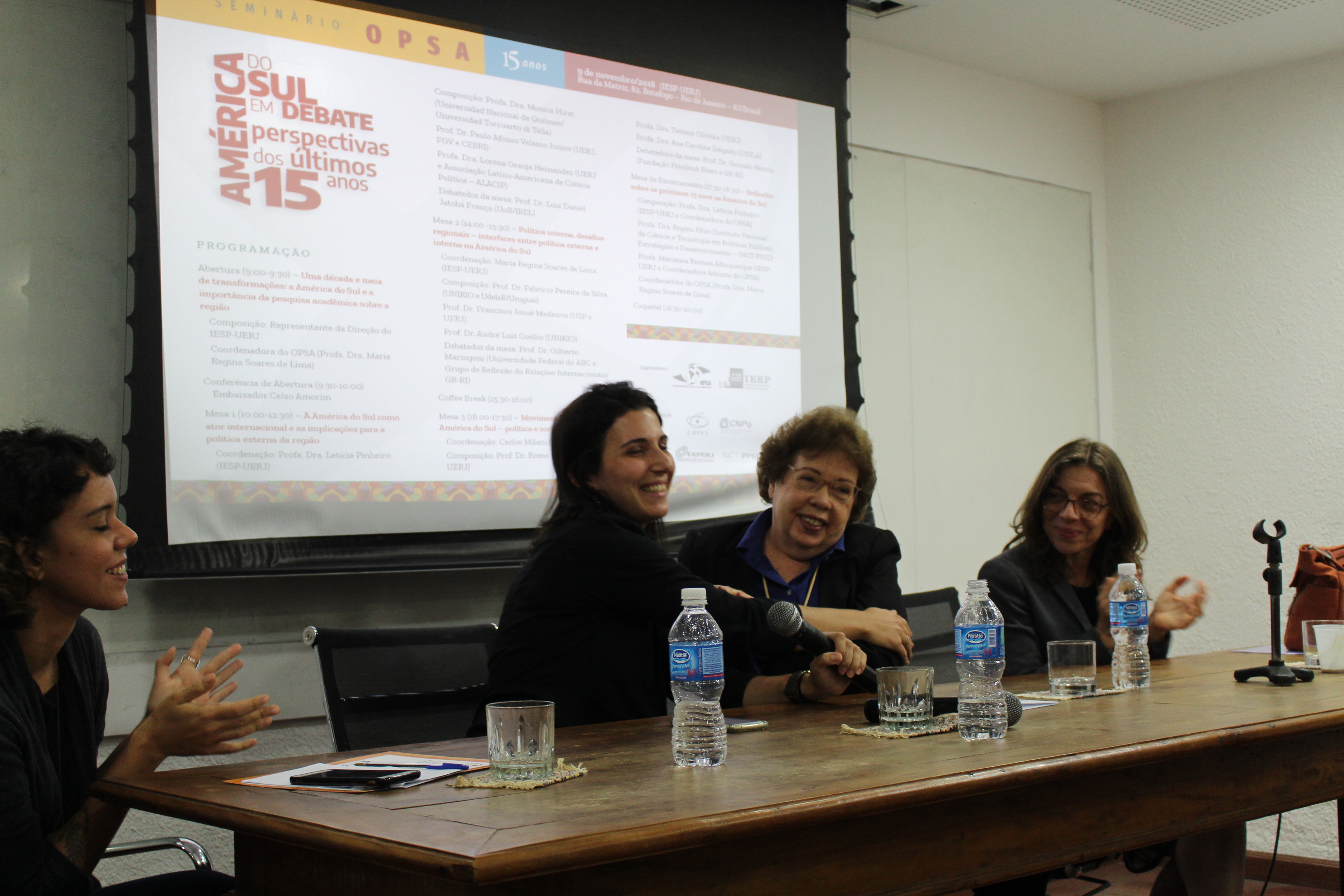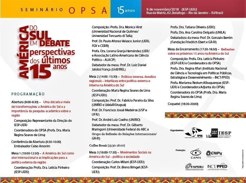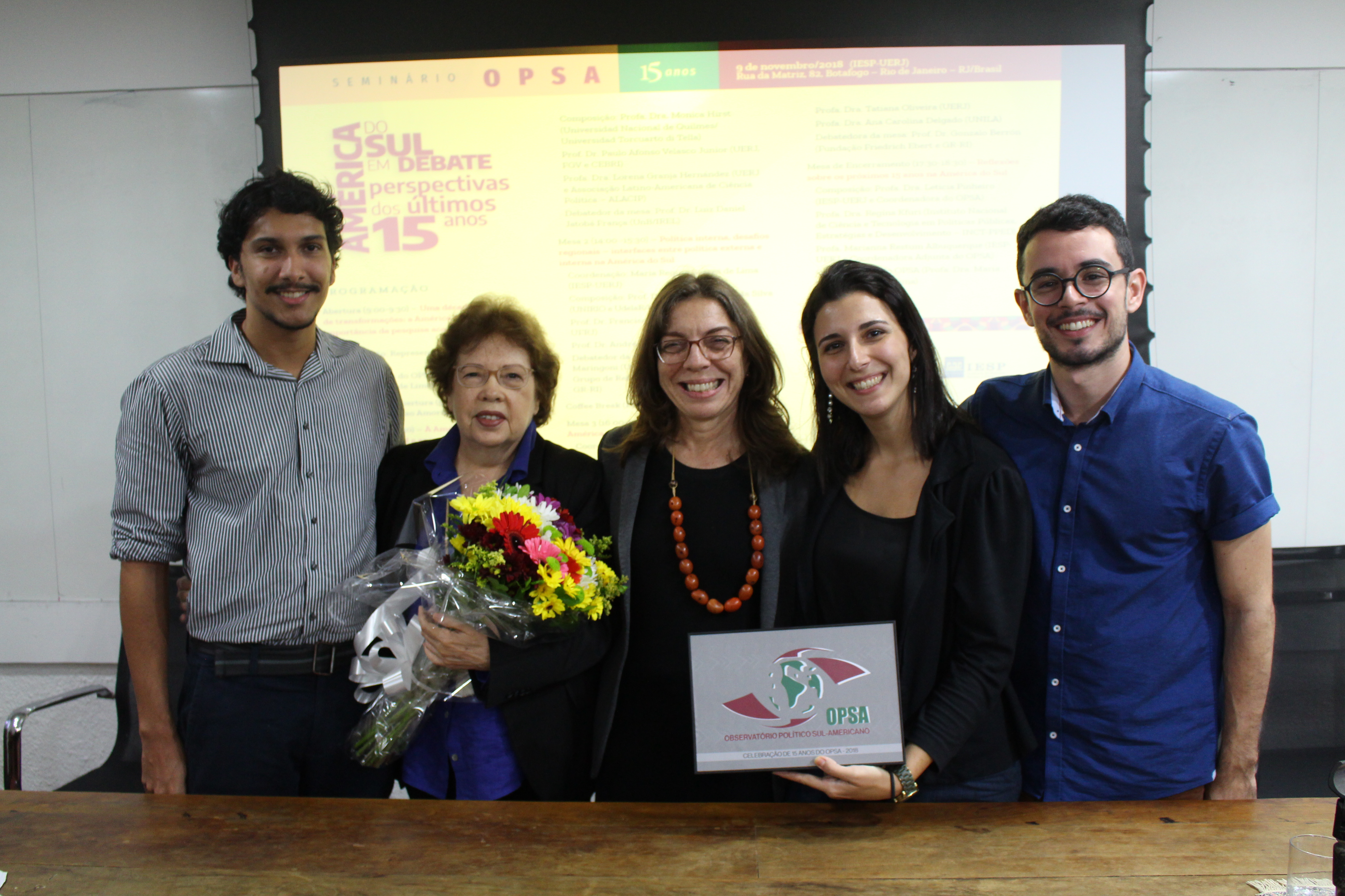 No dia 9 de novembro de 2018 foi realizado o “Seminário OPSA 15 anos – América do Sul em debate: perspectivas dos últimos 15 anos”. O evento contou com conferência de abertura do Embaixador Celso Amorim, além de diversas mesas de debates com professores convidados, muitos deles ex-pesquisadores do OPSA. Em sua mesa final, foi realizada uma homenagem surpresa à coordenadora do OPSA Maria Regina Soares de Lima.